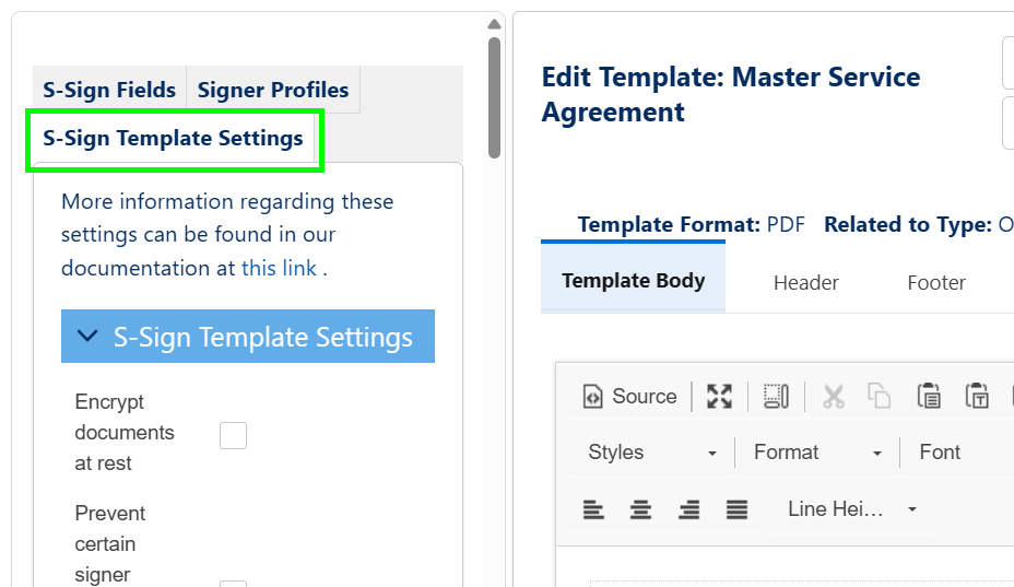 The S-Sign Template Settings are found within the S-Sign menu on the left side of the template editor for templates that are S-Sign enabled.